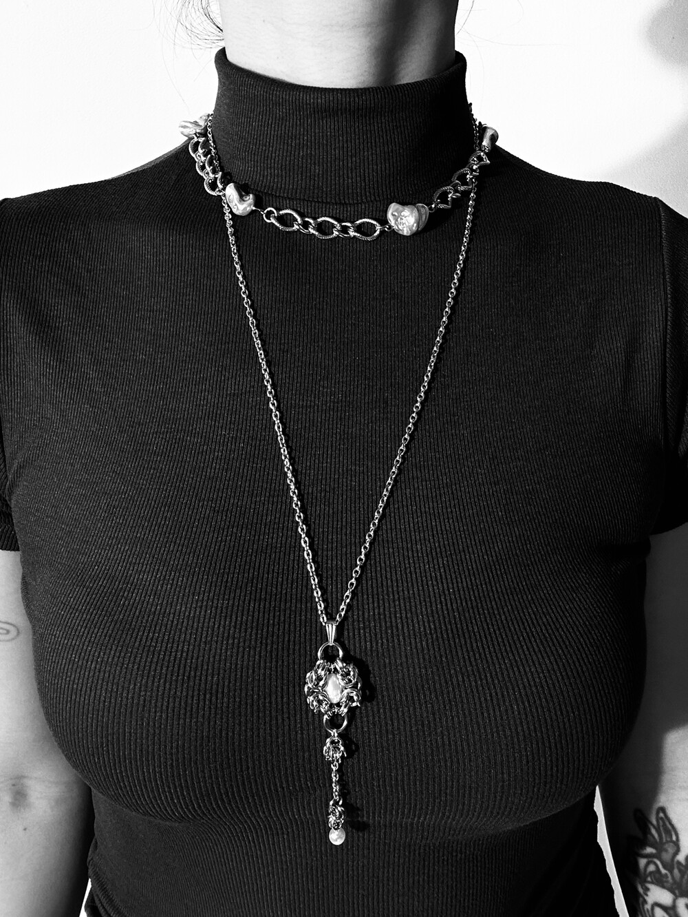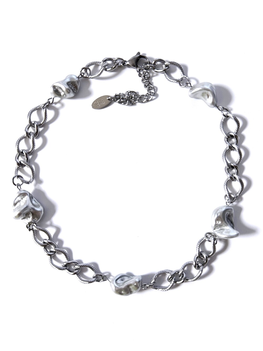 불규칙한 형태의 바로크 진주와 꼬임 체인이 교차되어 내추럴하면서도 고급스러운 분위기