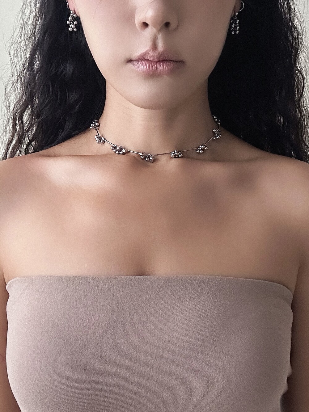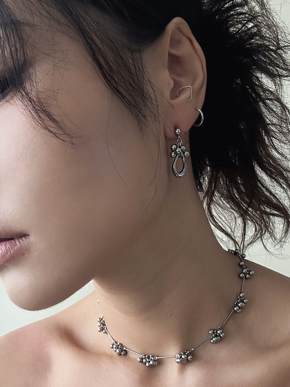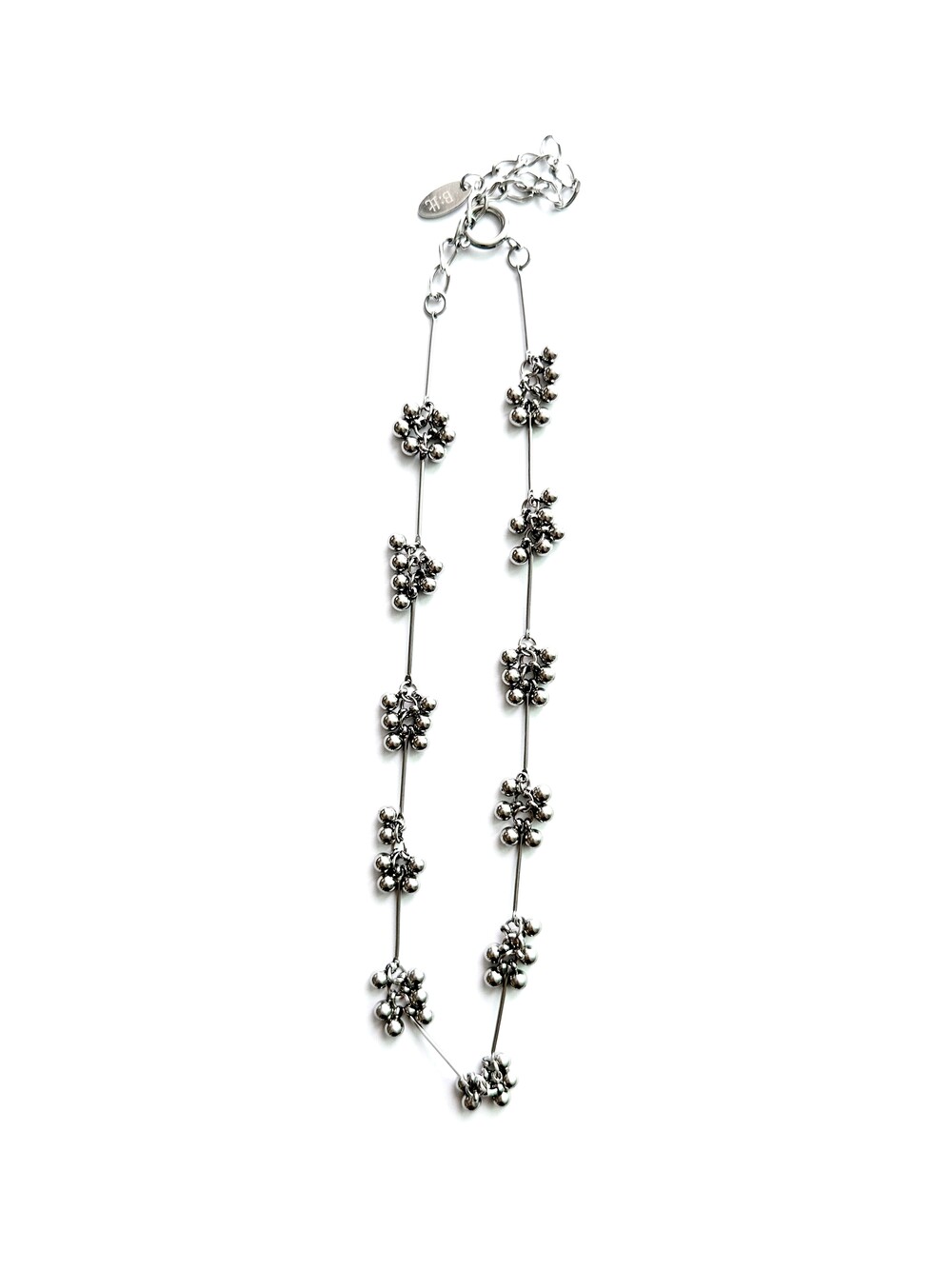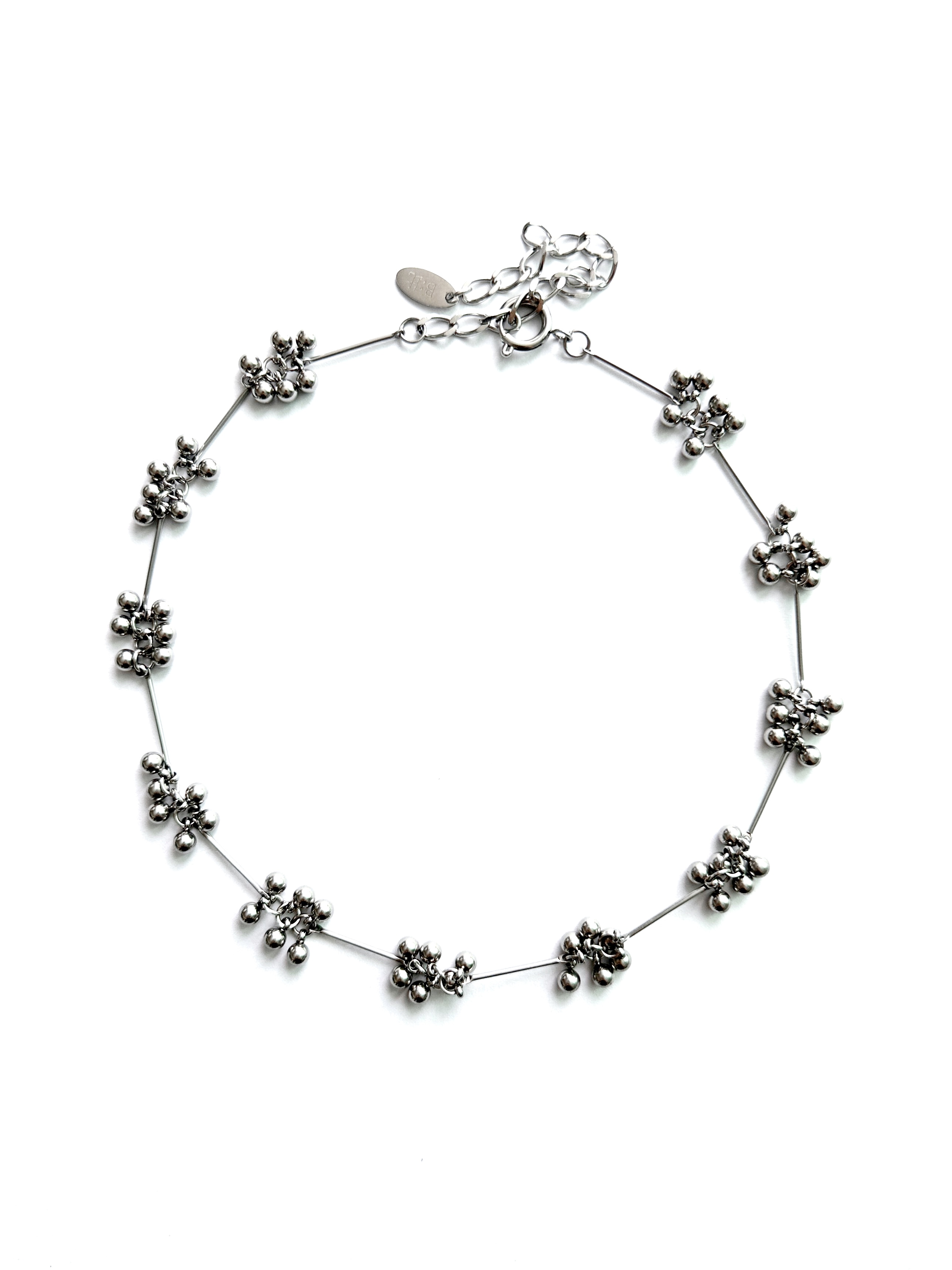 물방울이 맺힌 듯한 작은 실버 볼들이 군집을 이루어 체인 곳곳에 포인트로 배치된 디자인