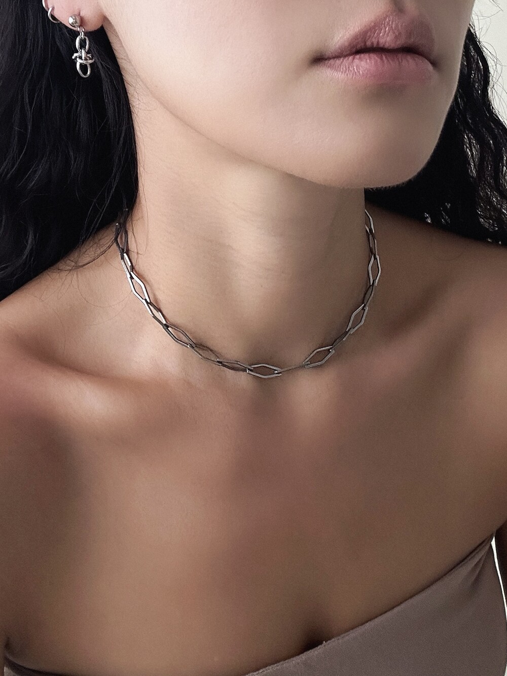 심플한 볼 스터드에서 내려오는 미니멀한 체인 구조가 세련된 무드를 연출