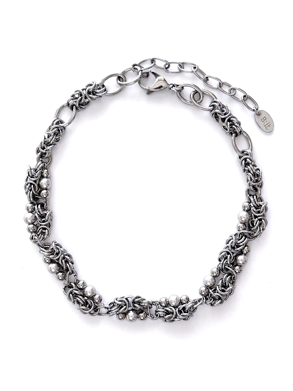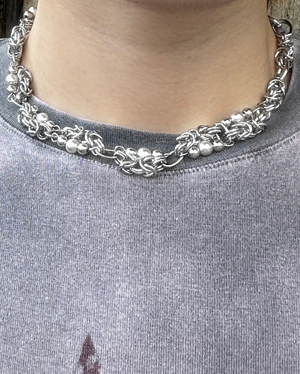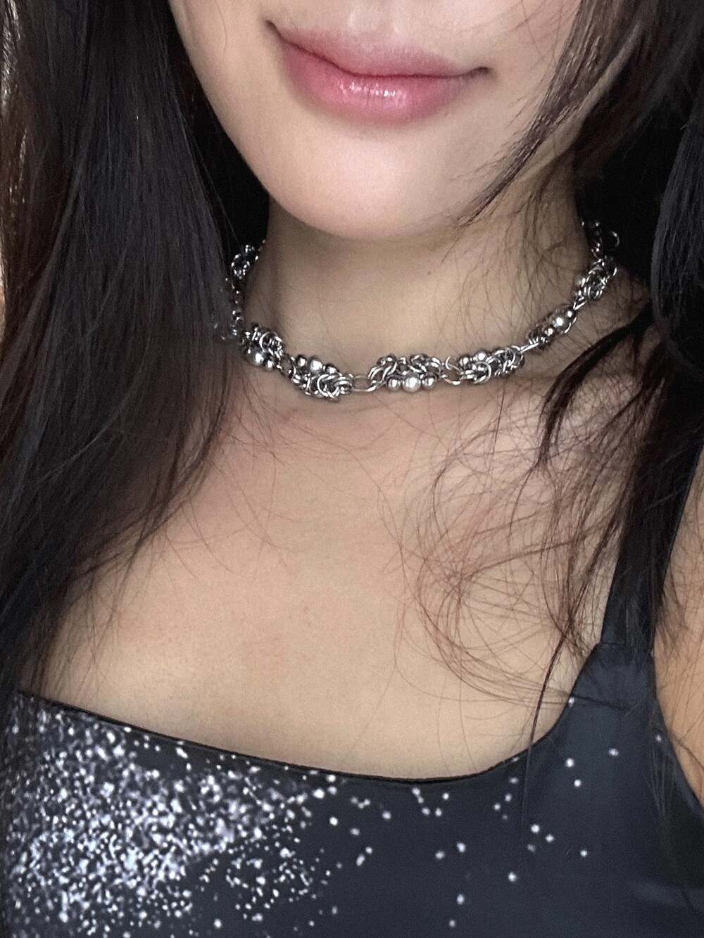 수작업 스테인리스 스틸 체인메일과 핵진주를 연결하여 엮어 디자인