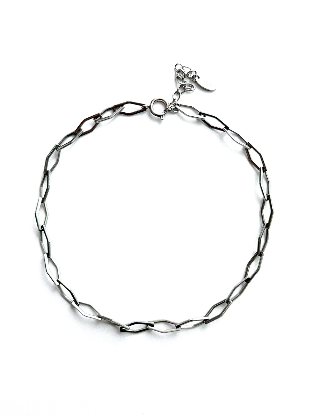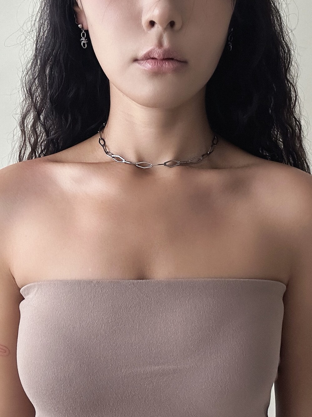 불규칙적으로 꼬여 있는 듯한 체인 구조가 자연스럽게 빛을 반사하여 세련된 분위기를 연출